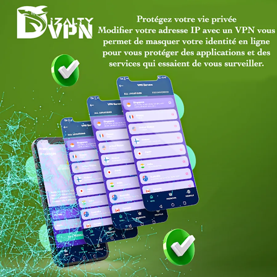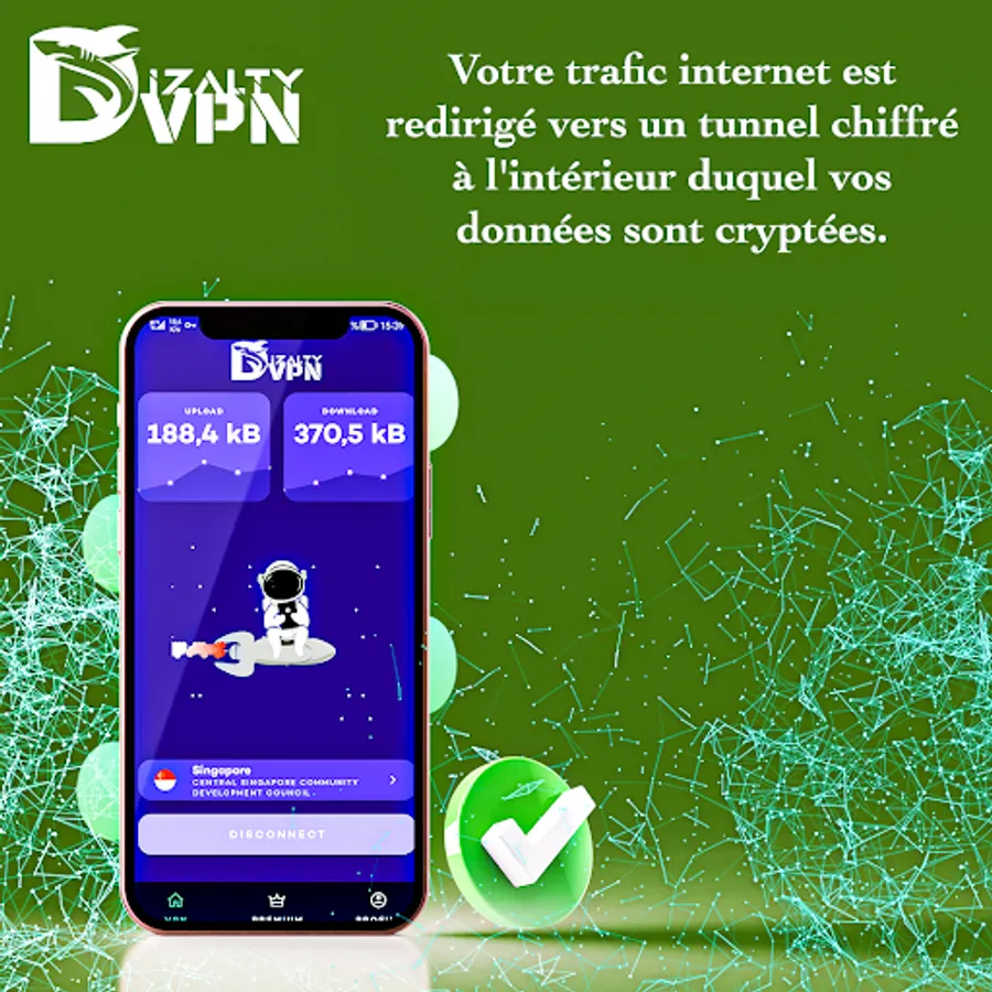 DIZALTY-VPN hides your IP address, encrypts internet traffic, turns public Wi-Fi into a private network, and helps unblock sites and apps on your Android phone so users can access any restricted content securely. anonymously.