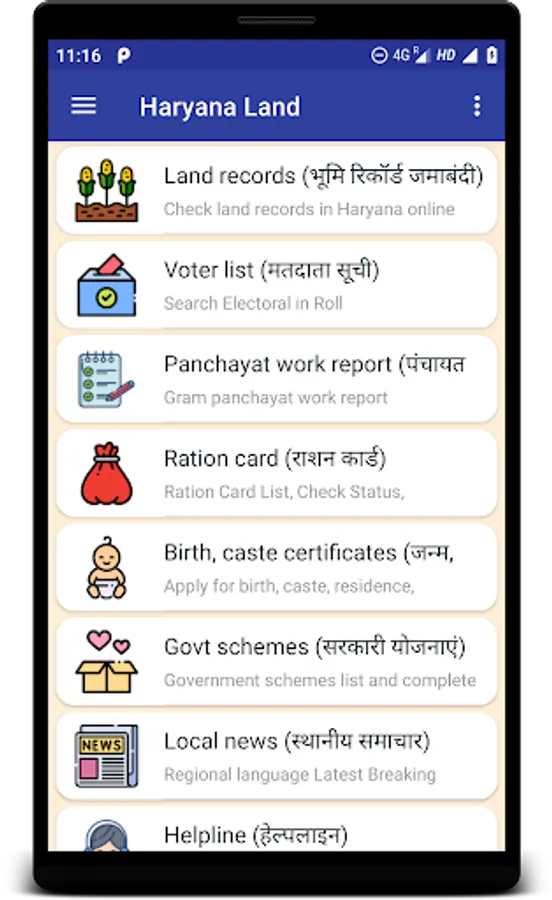 Land records (भूमि रिकॉर्ड जमाबंदी), Voter list (मतदाता सूची), Panchayat work report (पंचायत कार्य रिपोर्ट), Ration card (राशन कार्ड), Birth, caste certificates (जन्म, जाति प्रमाण पत्र), Govt schemes (सरकारी योजनाएं), Local news (स्थानीय समाचार), Helpline (हेल्पलाइन)