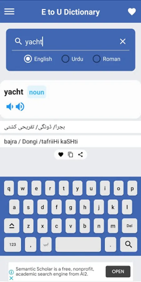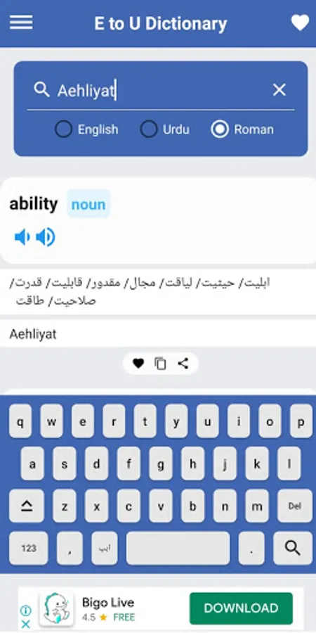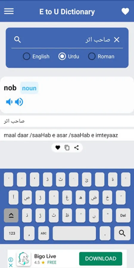 Offline English to Urdu Dictionary by Vocabineer helps users translate from English to Urdu and Urdu to English meanwhile making the text more readable by providing Roman Urdu. E to U Dictionary also enables users to save their favorite words and use them for memorizing for later use. The Dictionary has a robust feature of Urdu to English translation with thousands of words.