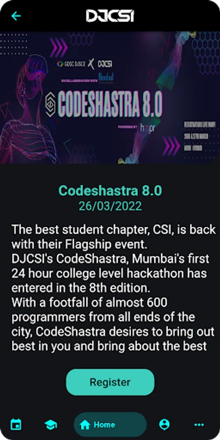 Also this application acts as a bridge between participants and all the competitions held by DJCSI. All the events and their details are included in the application itself. Any participant can also register themselves through the app.