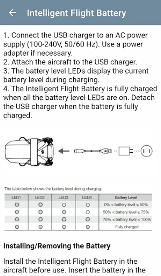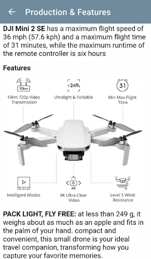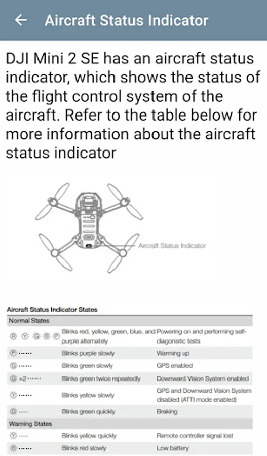 In the content of this app, you can find explanations containing the above titles. The app is a guide with information about DJI Mini 2 SE.
