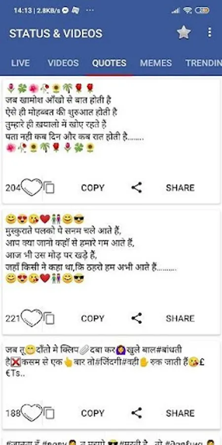 This app got a huge collection of Video status, Photo status, and Text Status for Social Media like Welike, Whatsapp, Facebook, Tik Tok, also for TV Serial & Bollywood.