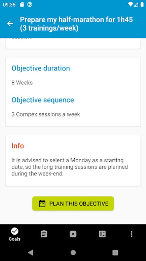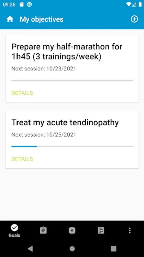 - Find an objective that fits your needs (eg: prepare for a marathon, triathlon or cycling race, Treat a back pain or tendinopathy, Increase your strength…) and set up the plan to reach it.
