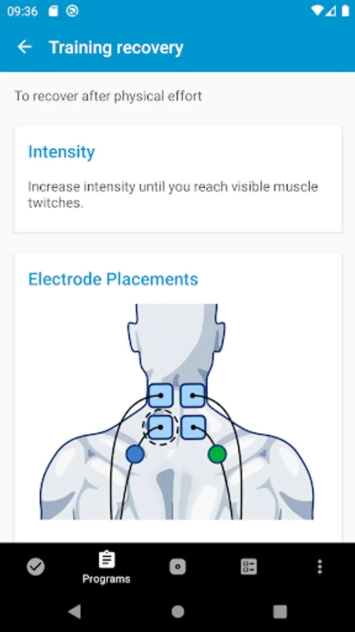 - Provide all the details for each Compex programme (description, usages, effects, stimulation intensity, electrodes placements)