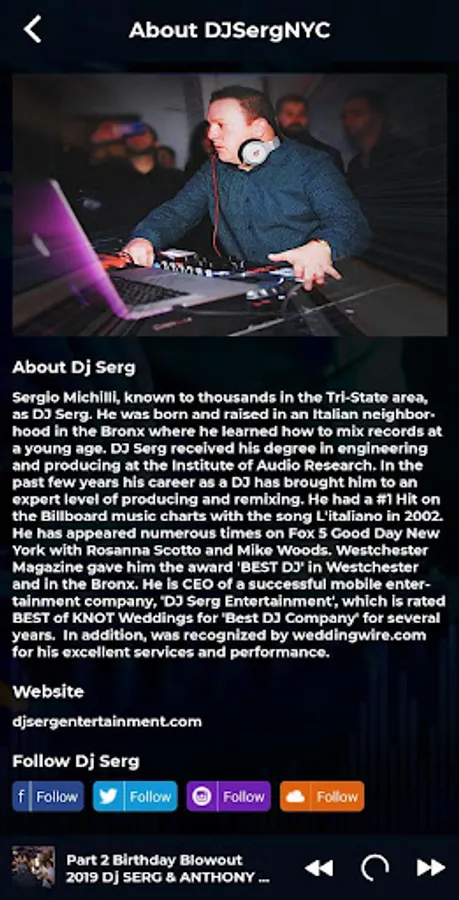 Sergio Michilli, known to thousands in the Tri-State area, as DJ Serg. He was born and raised in an Italian neighborhood in the Bronx where he learned how to mix records at a young age. DJ Serg received his degree in engineering and producing at the Institute of Audio Research. In the past few years his career as a DJ has brought him to an expert level of producing and remixing. He had a #1 Hit on the Billboard music charts with the song "L'italiano" in 2002. He has appeared numerous times on Fox 5 Good Day New York with Rosanna Scotto and Mike Woods. Westchester Magazine gave him the award "BEST DJ" in Westchester and in the Bronx. He is CEO of a successful mobile entertainment company, "DJ Serg Entertainment", which is rated BEST of KNOT Weddings for "Best DJ Company" for several years. In addition, was recognized by weddingwire.com for his excellent services and performance.