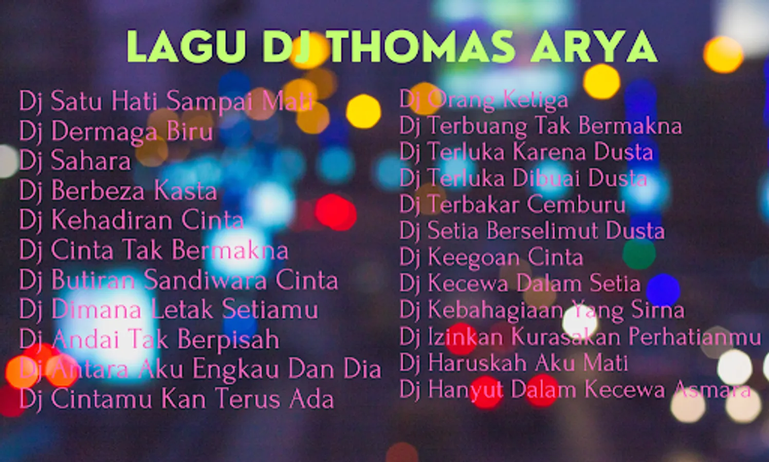 This application contains DJ Remix Slow Bass Thomas Arya songs, which can be used for driving friends, work or leisure activities. the music and the water is good. you can use it without an internet connection (offline)