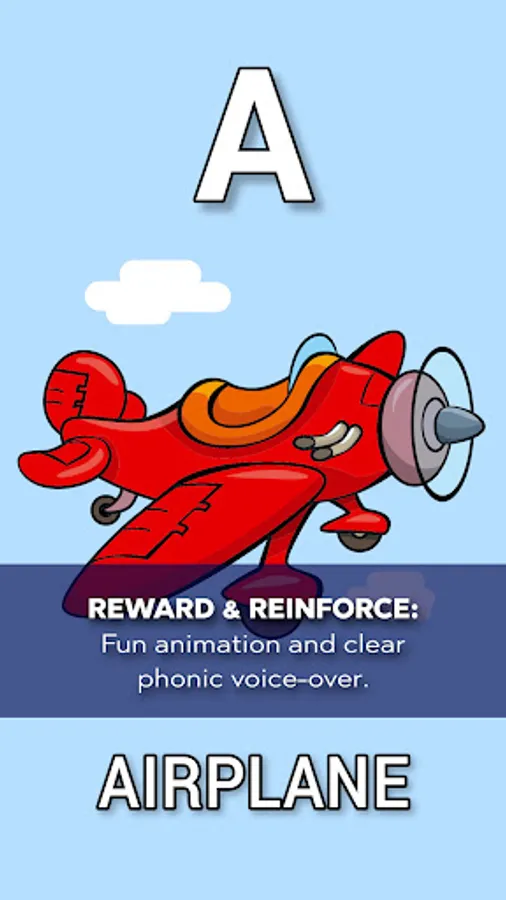 Phonics Introduction: Each letter is paired with a corresponding object to build foundational phonics skills (A is for Airplane, B is for Bear, etc.).