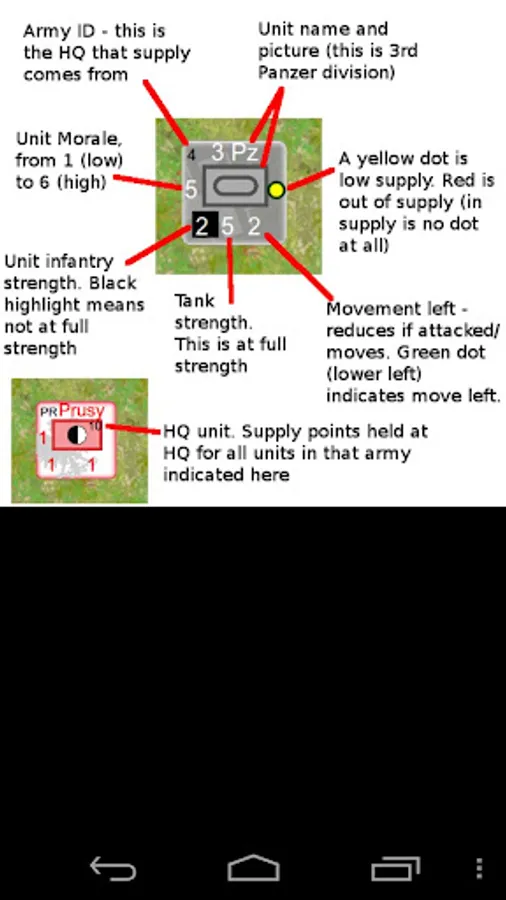 The units represent the military formations actually present in 1939. Mostly these are divisions, but some are brigades or army headquarters. You can place (stack) up to five units in a single hex. Tapping on the hex will rotate the units, with the selected one at the top.