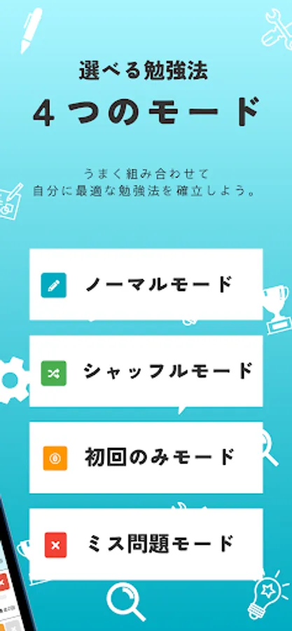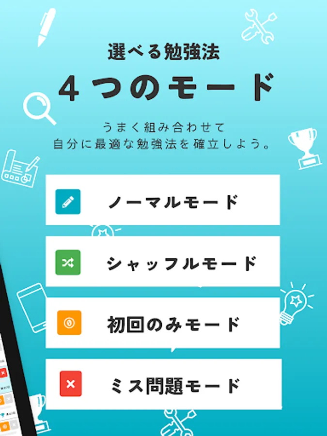 ・ In "Shuffle mode", the questions are the same as in normal mode, but the order in which the questions are asked is random. Prevents you from remembering the answers in the order of the questions.