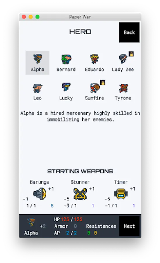 * 8 heroes with different starting weapons and personal stats