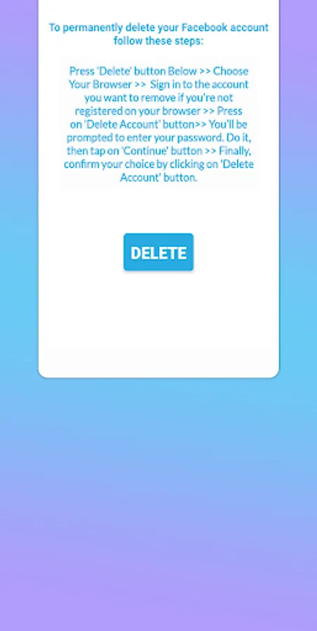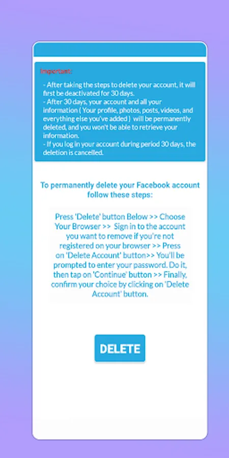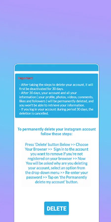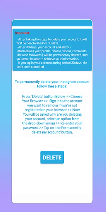Delete Account app give you a direct link to delete instagram, facebook account permanently.