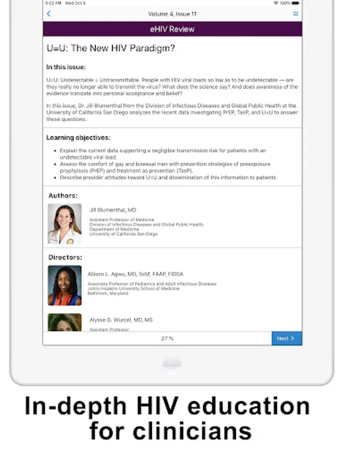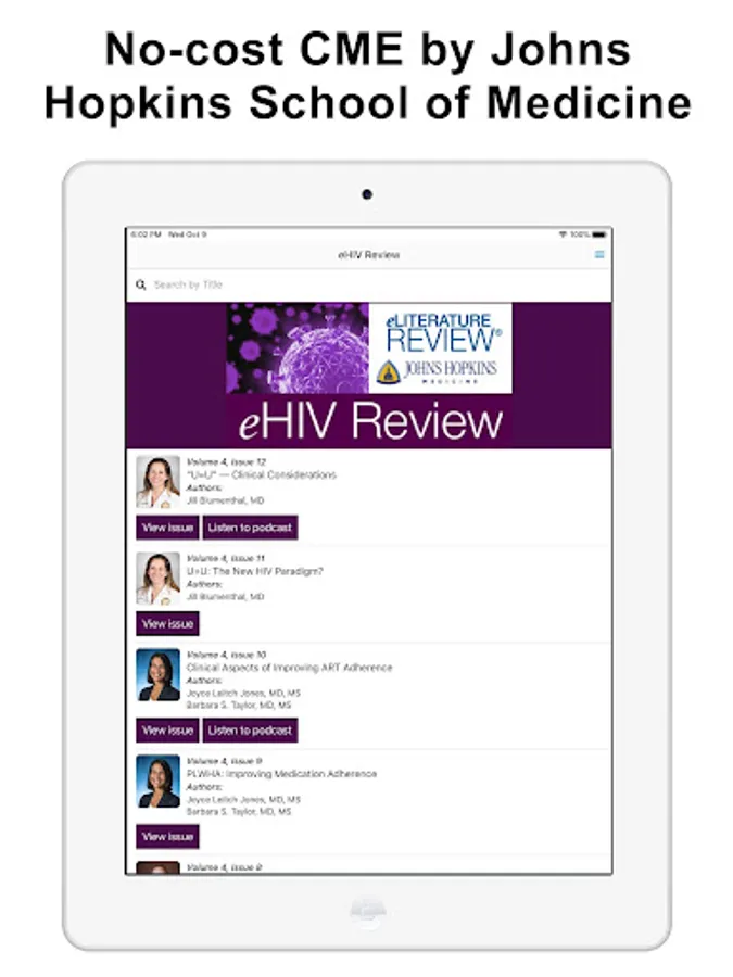 eHIV Review is a no-cost CME program developed by Johns Hopkins University School of Medicine (JHUSOM) in partnership with DKBmed. Expert insight and analysis providing information directly relevant to HIV care, through topic-focused newsletters summarizing the peer-reviewed literature with accompanying podcasts to illustrate how to apply that information in the clinic.