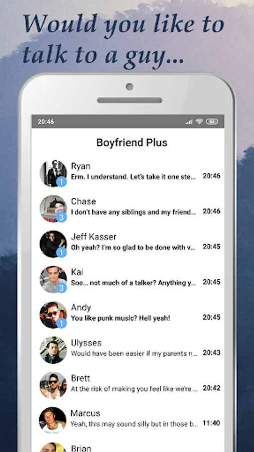 Start a conversation with a cute sweet guy. Perhaps you met at a club, or maybe it was on a motorcycle forum. As you get to know each other better, he'll send you pictures and voice messages. Choose wisely and you might just end up calling him your boyfriend. Who needs a boyfriend when you have Boyfriend Plus?