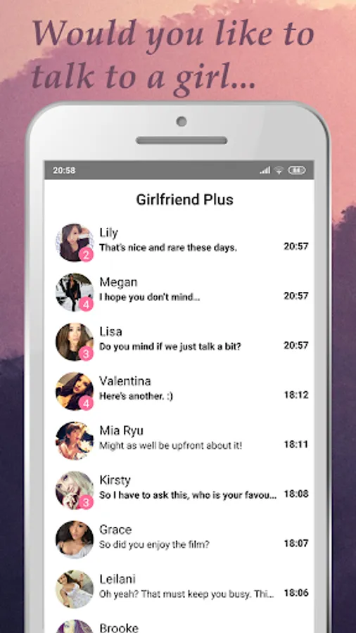 Start a conversation with a beautiful intelligent woman. Perhaps you met at a party, or maybe it was while taking a stroll through the park. As you get to know each other better, she'll send you pictures and voice messages. Choose wisely and you might just end up calling her your girlfriend. Who needs a girlfriend when you have Girlfriend Plus?