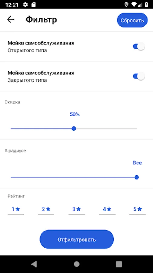 * Automatic self-service car washes and car washes on the map with the ability to filter by type, rating, distance and cost.