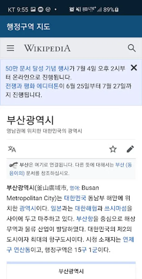 If you tap the name of "City City" or "Si/Gun-Gu" at the top, the corresponding information of Wikimedia is displayed.
