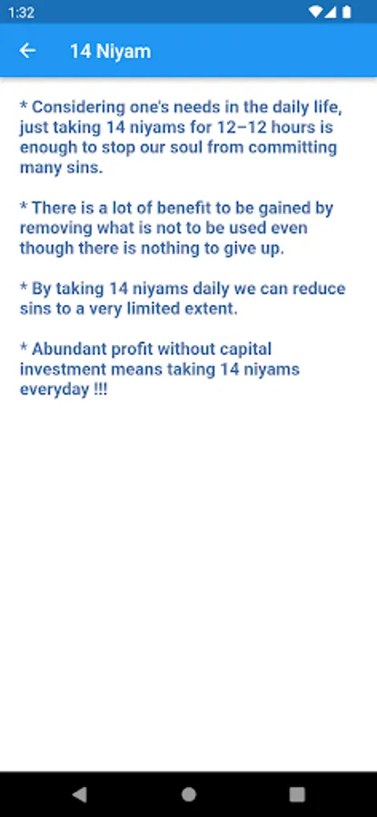 Considering one's needs in the daily life, just taking 14 niyams for 12–12 hours is enough to stop our soul from committing many sins.
