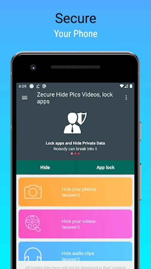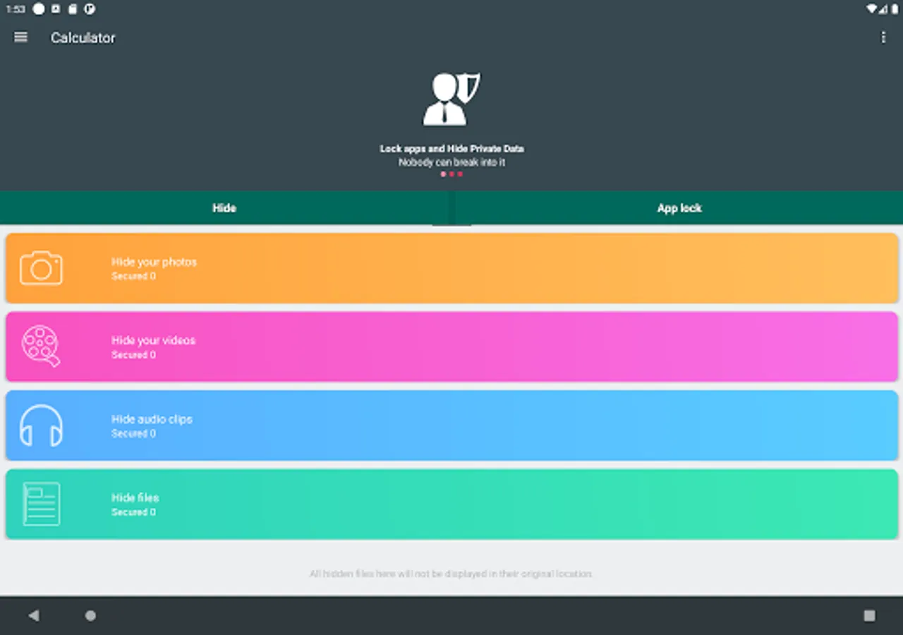 you can secretly Hide Photos, Hide Videos and other files . Your files will be secretly stored in vault and can only be viewed after a pattern is entered on this app.