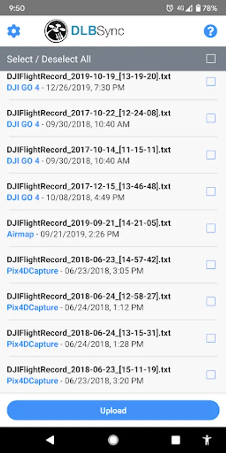 DLB Sync simply imports your flights from major mobile drone flight control apps natively to your DroneLogbook account. This app can sync flights into DLB Sync from your flight control apps when offline or in poor mobile coverage, then upload flights to DroneLogbook account when you have mobile or WIFI coverage.