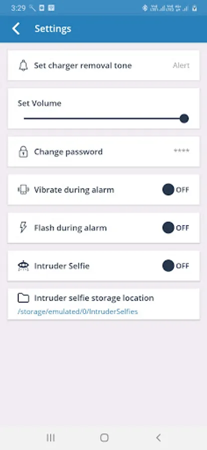 - Using your phone front camera, the app will capture a photo of the thief. its show thief photos in Charger Removal Alarm Anti Theft Security folder.