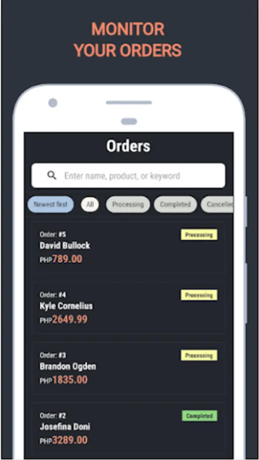 See and filter the list of your orders by status. Ordu will arrange them by processing, completed, or cancelled.