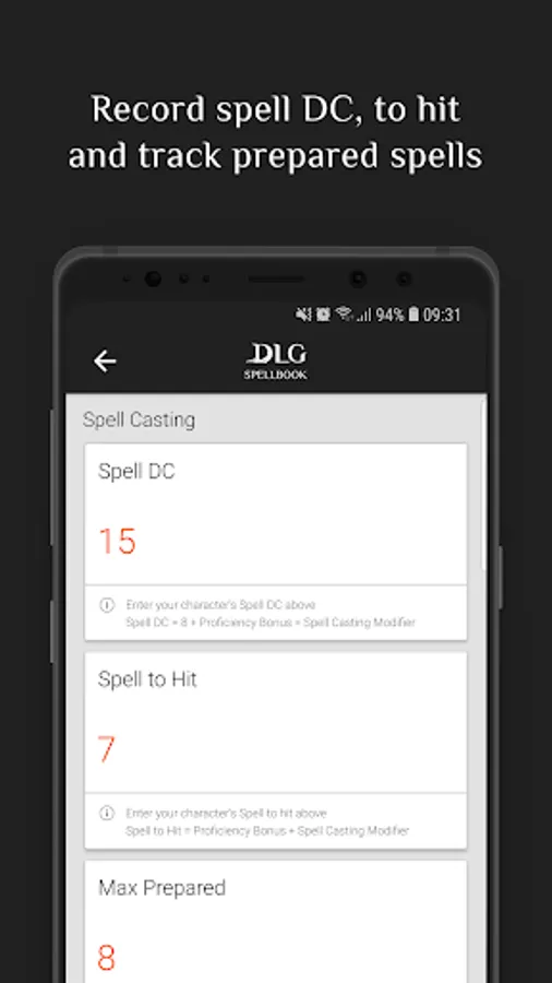 - View your Spell DC, Spell to Hit and Maximum Prepared Spells