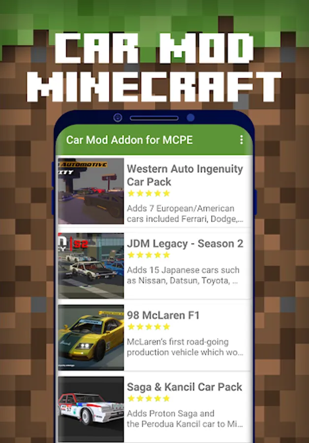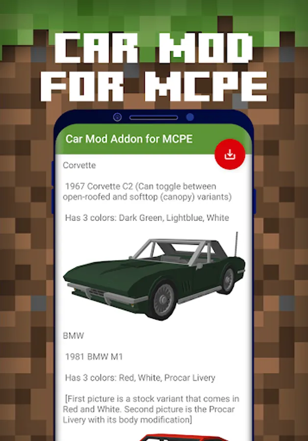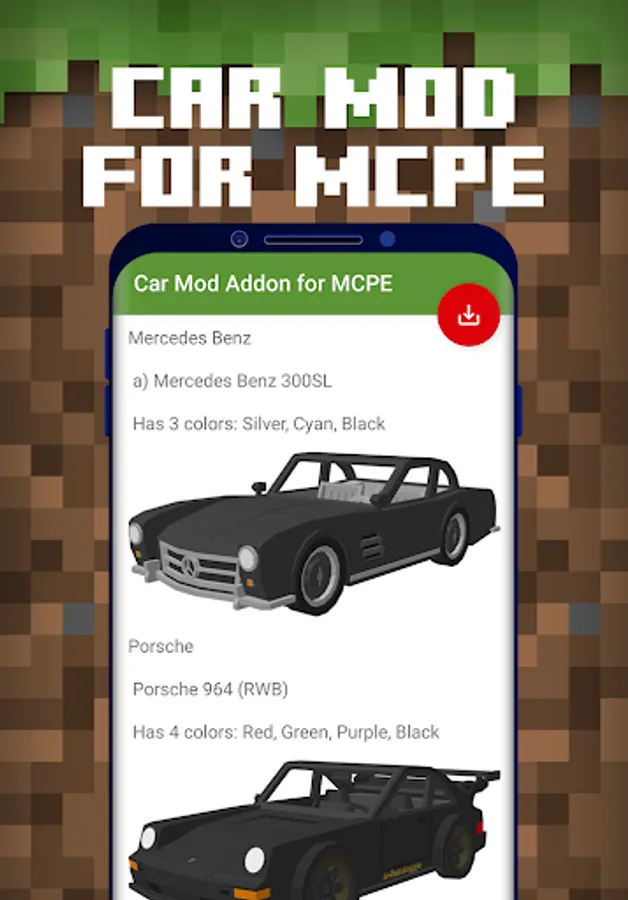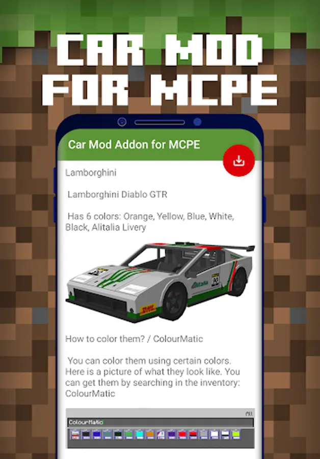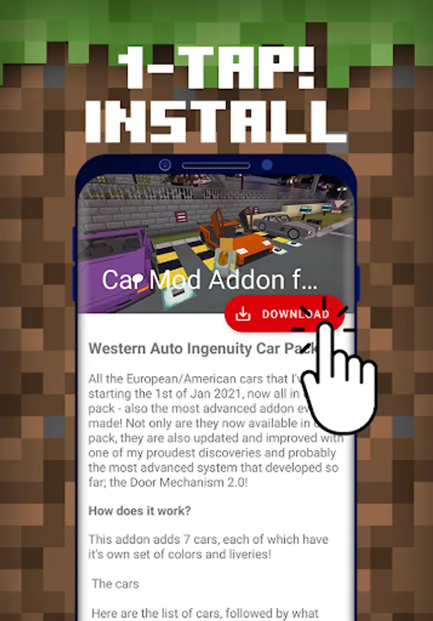 Car Mod for Minecraft PE is a free downloadable content for Minecraft Pocket Edition game, where you can automatically download & install huge collections of Car Automotive Mod to your Minecraft Bedrock world in 1-Tap!