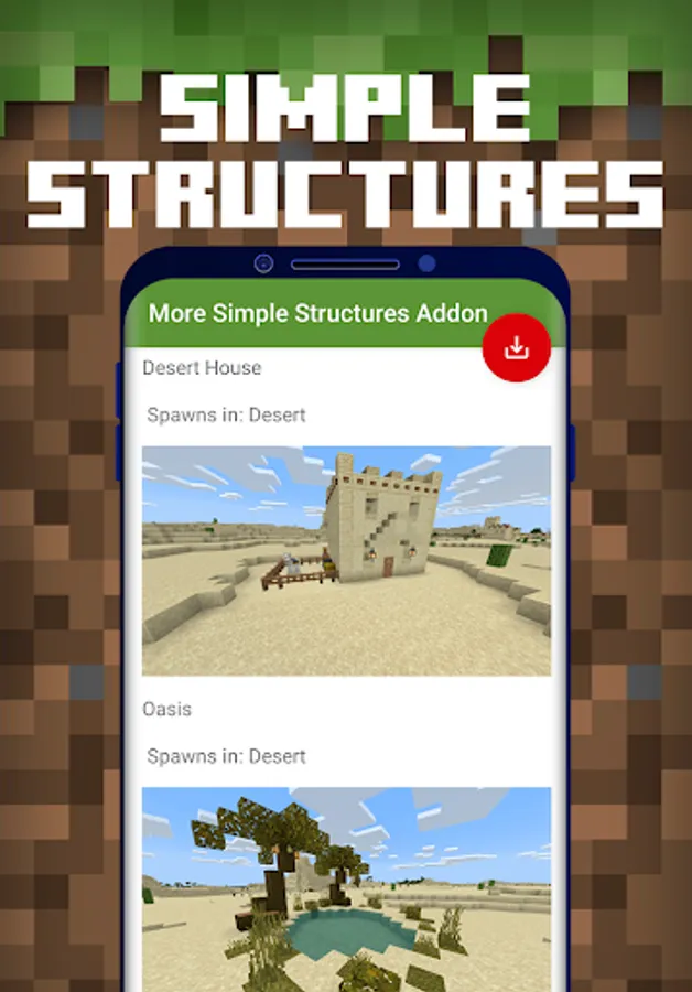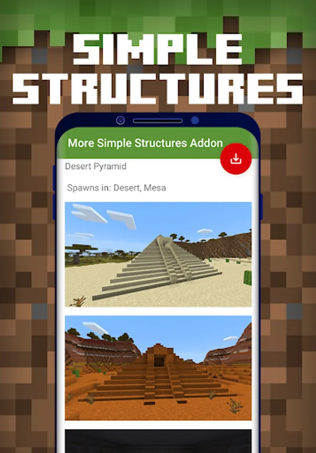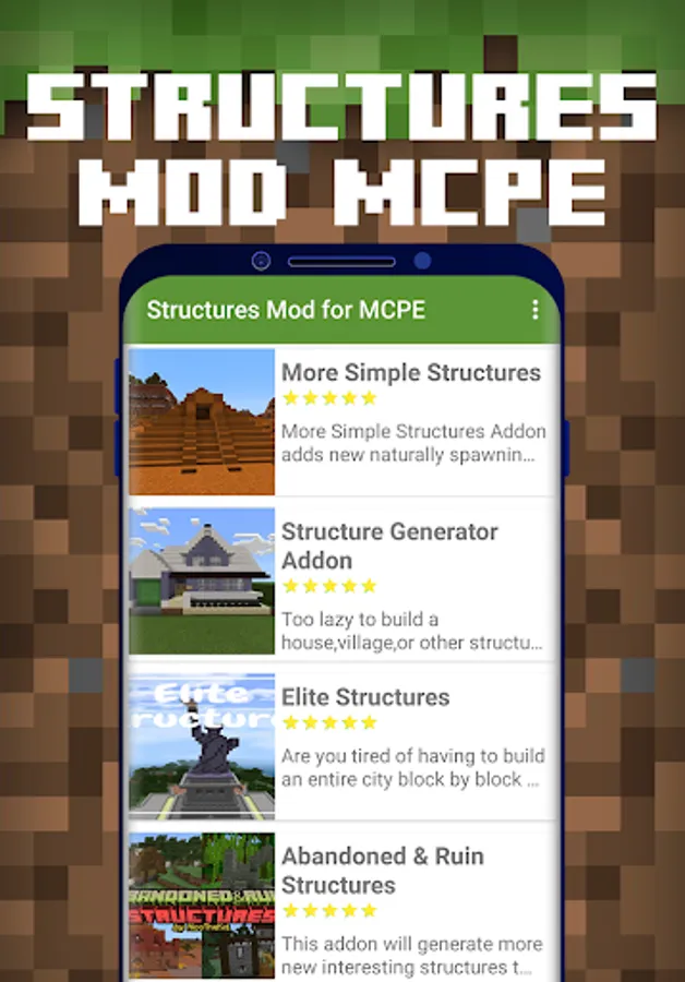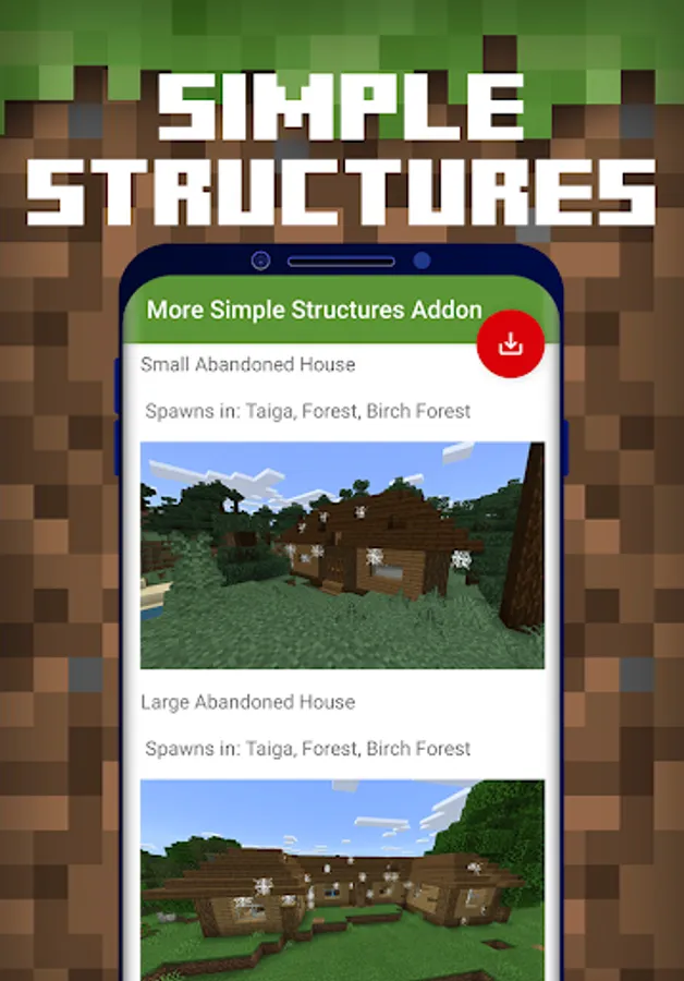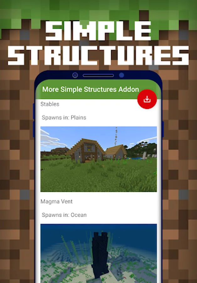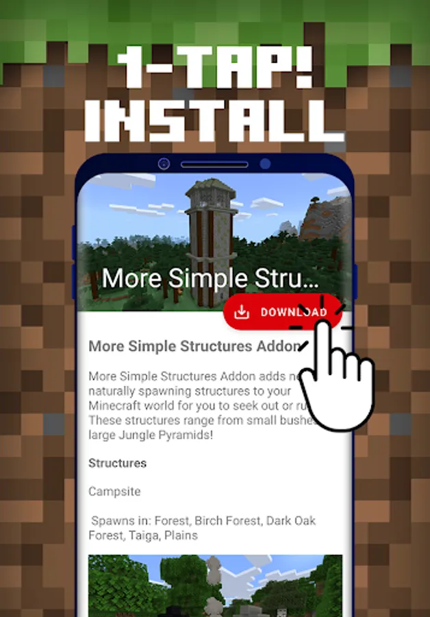 Structures Mod for Minecraft PE is a free downloadable content for Minecraft Pocket Edition game, where you can automatically download & install huge collections of Structure and Building Mods to your Minecraft Bedrock world in 1-Tap!