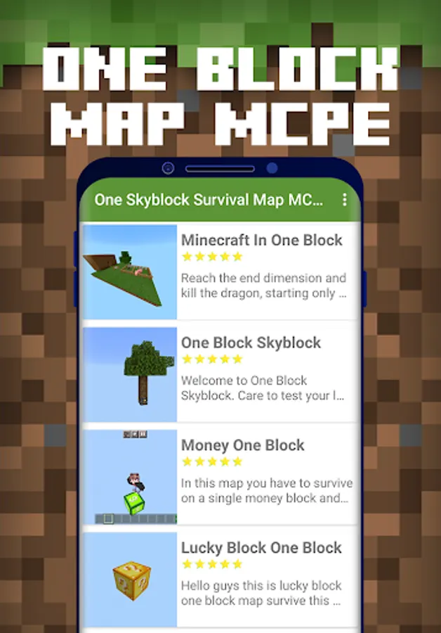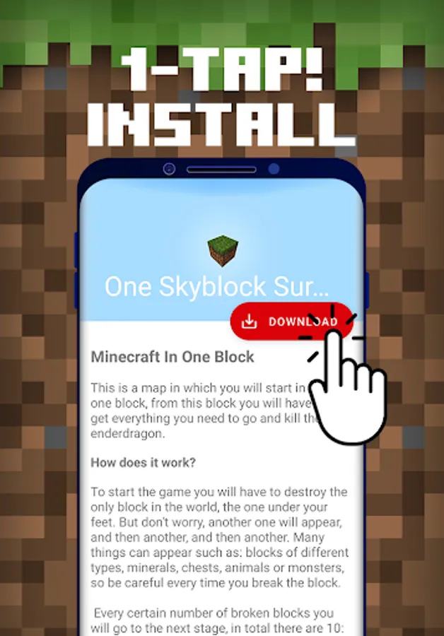One Block Map for Minecraft PE is a free downloadable content for Minecraft Pocket Edition game, where you can automatically download & install huge collections of One Block, Skyblock and many Survival Map to your Minecraft Bedrock world in 1-Tap!