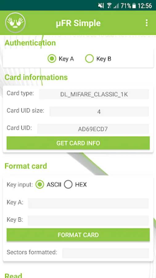 App requires external µFR Series NFC Reader: https://www.d-logic.net/nfc-rfid-reader-sdk/
