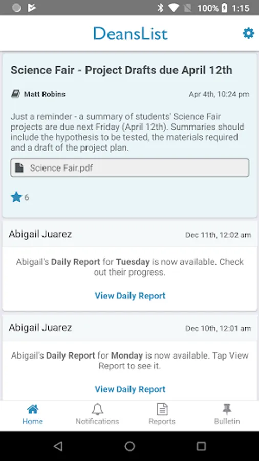 DeansList for Families makes it easy for students, parents/guardians to stay connected with their school! View your school's bulletin board, student report cards, individualized notifications and more!