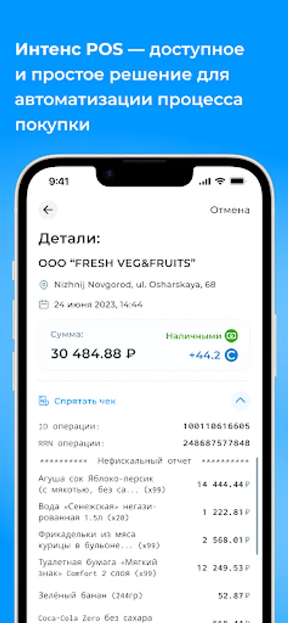 Intense POS is an affordable and simple solution for automating the purchase process. The application is installed free of charge on a phone or tablet and connected to your cash register equipment.
