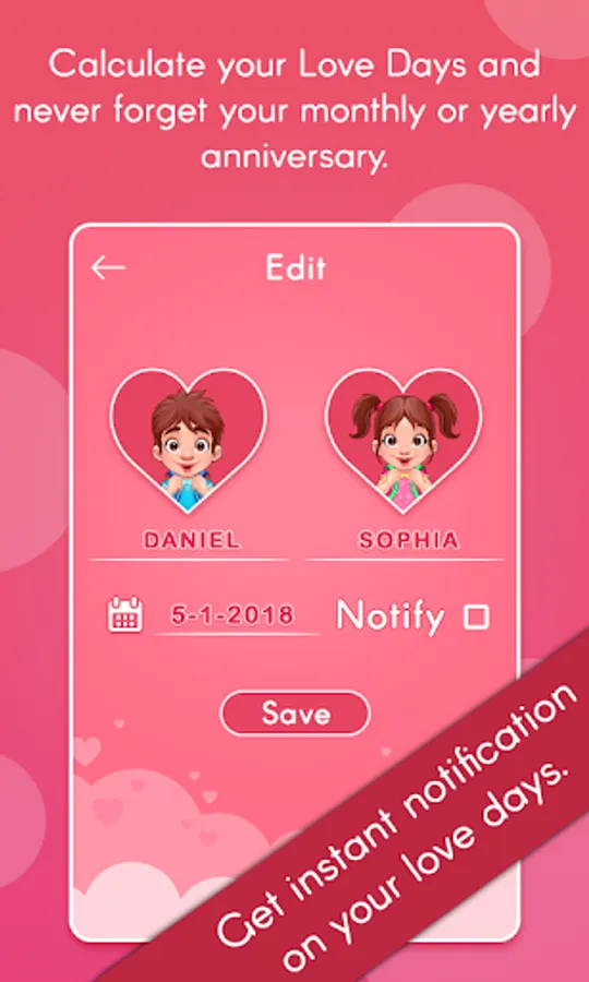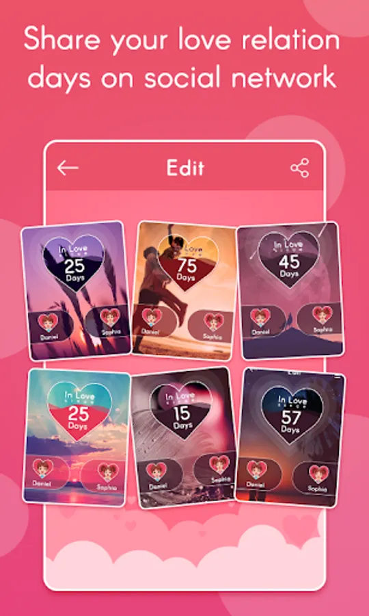 How long have been togather? Count Your Love Days in a very unique style by creating love image. Add your Love relationship date, add your photo and your girlfriend's photo, also choose from specially designed love theme backgrounds. Get love notfication as the way you would like - dailt, weekly anniversary, monthly anniversary or yearly anniversary. Never forget your love anniversary. Celebrate love anniversary always. Share your love status with this love counters days photo. Type your and your girfriends name in unique font style to create a personal touch.