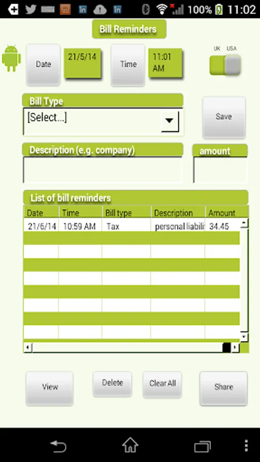 You can choose the date format US or UK, check the actual reminders stored on your phone, delete items from the table that you no longer need reminders for and share them via email - for example you may need to supply to a financial service provider, debt agency - or simply to keep your own record on your laptop.