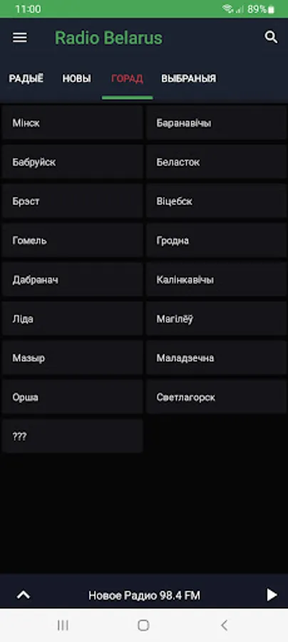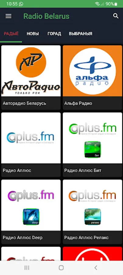 Listening to radio stations from Belarus on Android phone. The application has 90 stations.