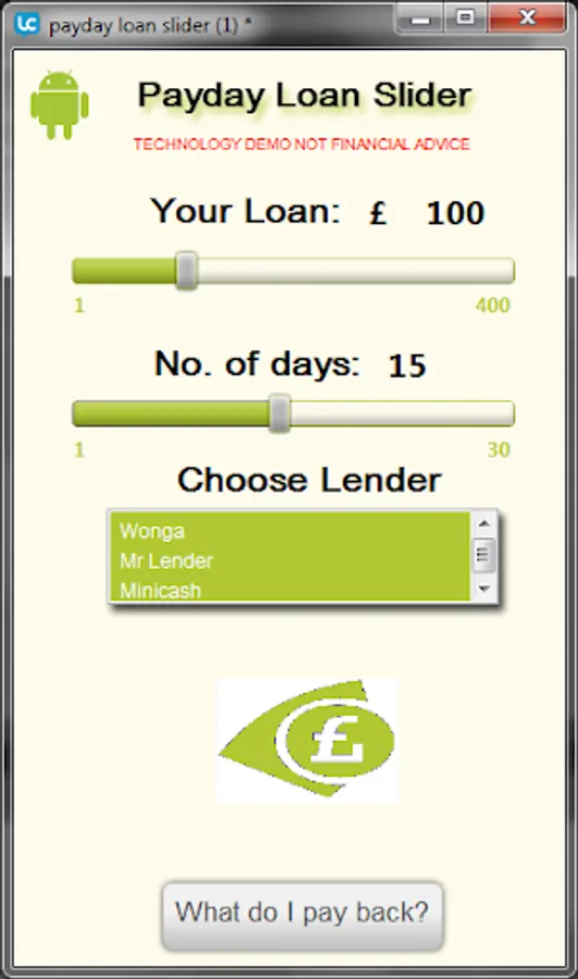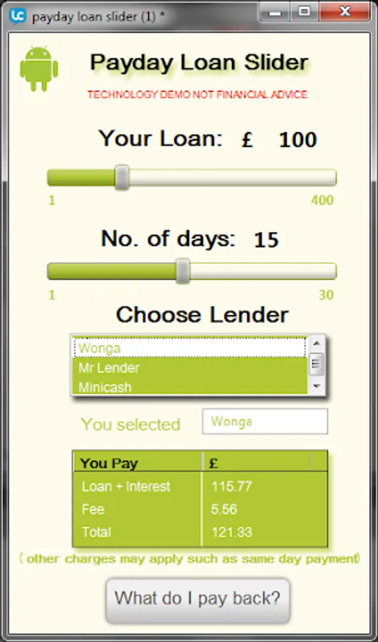 The payday loan slider lets you slide the amount you want to borrow, slide the duration (up to 30 days), select a provider and then click to see what you'd pay bak.