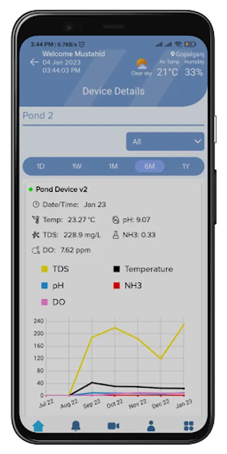 There are 5 different sensors attached to the MoreFish device that is DO, TDS, NH3 & pH of water (Salinity sensor can be added if required). The pH measurement monitoring every 10 minutes of pH level of the water body proving beneficial for both fish and fish farm.