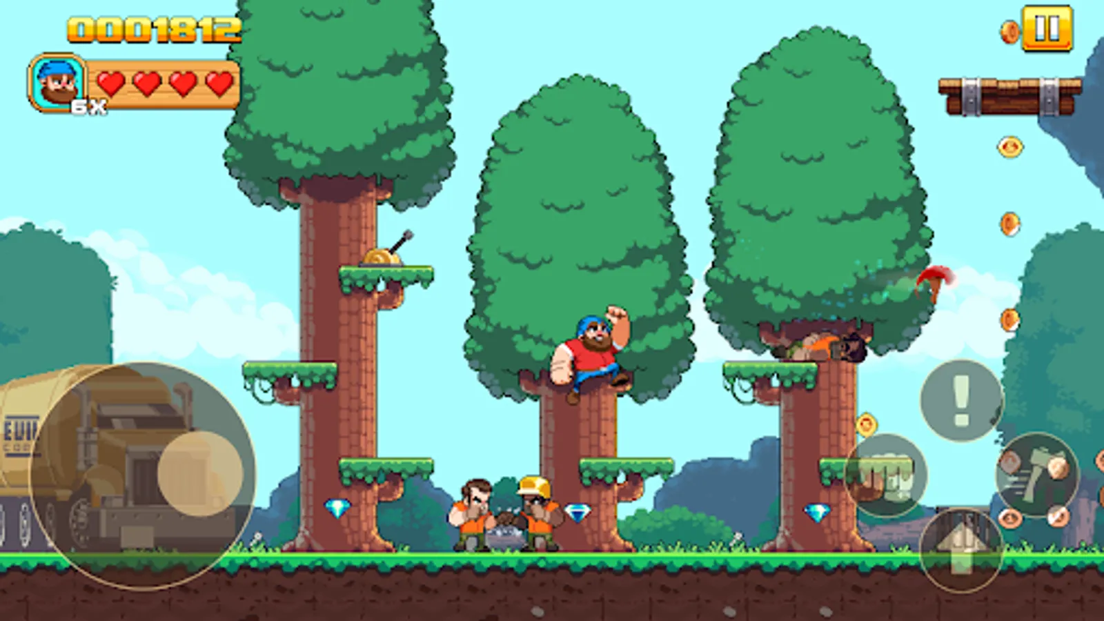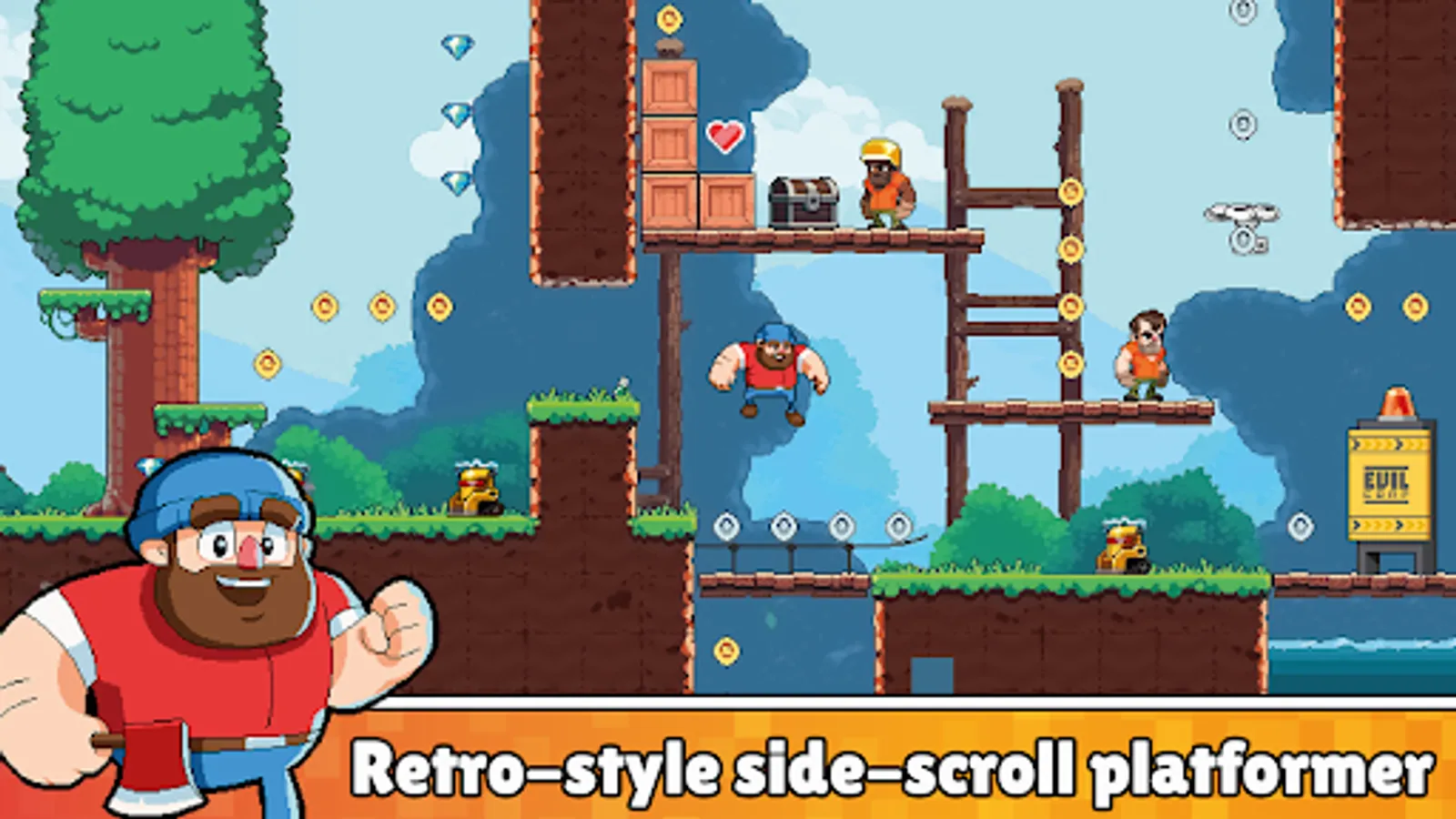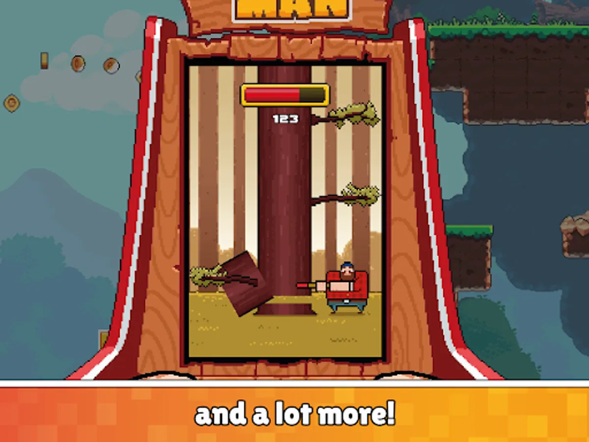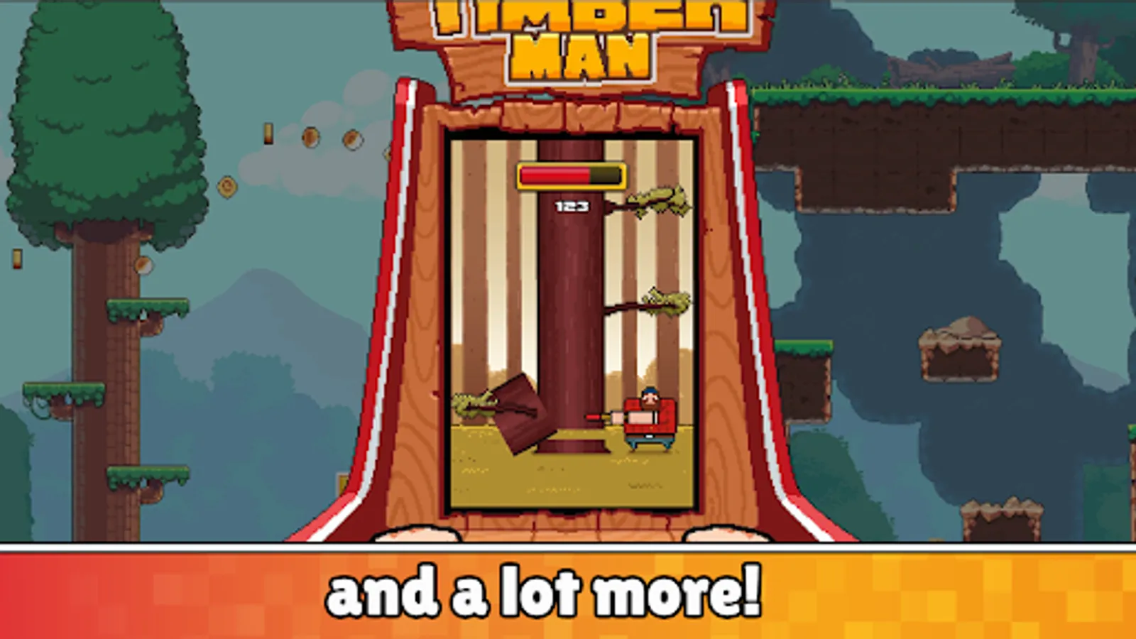Timberman The Big Adventure is a brand new 2D side-scrolling platform adventure game! Timberman is back on a quest to save his friends and stop the Evil Corp! Play as Timberman, exploring forests and chopping down trees to defeat enemies and solve puzzles that block your path. Collect gold coins to unlock new weapons, upgrades, and helpful power-ups. Play by yourself or with your friend in local multiplayer!
