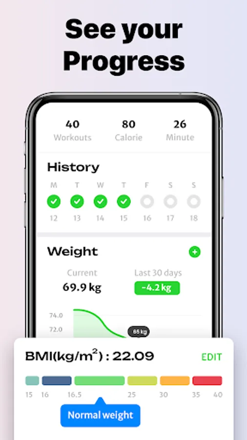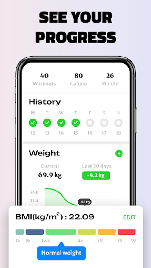 View detailed workout reports that provide information on calories burned and workout duration. Keep track of your progress and BMI history by regularly entering your weight.