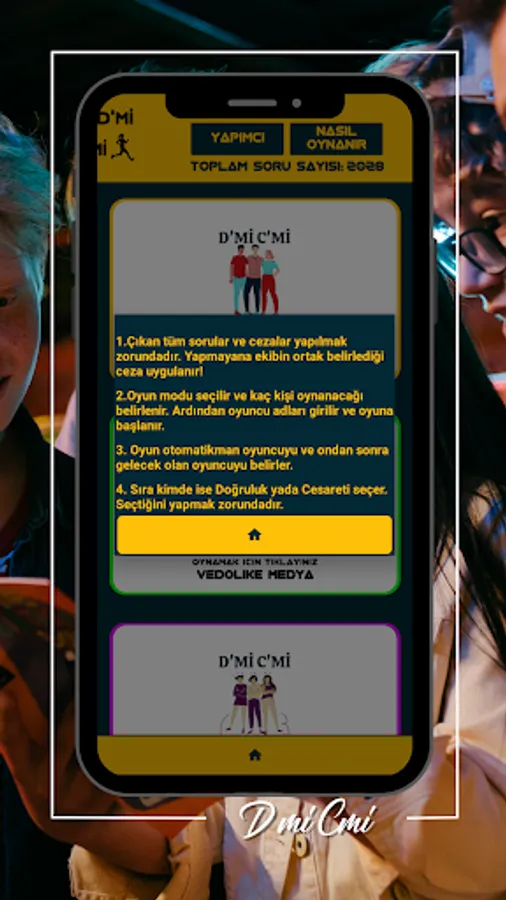 Is it truth? Courage? our game, D'mi C'mi, entertains you by asking questions with your friends in the best way possible. Our application has hard mode and easy mode. If you just want to look at the questions, this is available in our game.