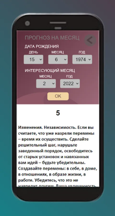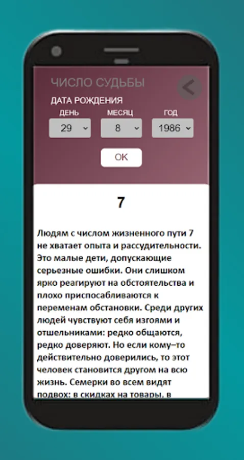 With the help of our application, you can find out your fate number (life number) by indicating your date of birth. Calculate the number of any day and its description by specifying the date of birth and a specific number. Also the day of the month and the day of the year, all sections and functions are available immediately and are absolutely free.