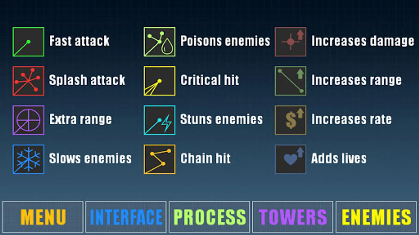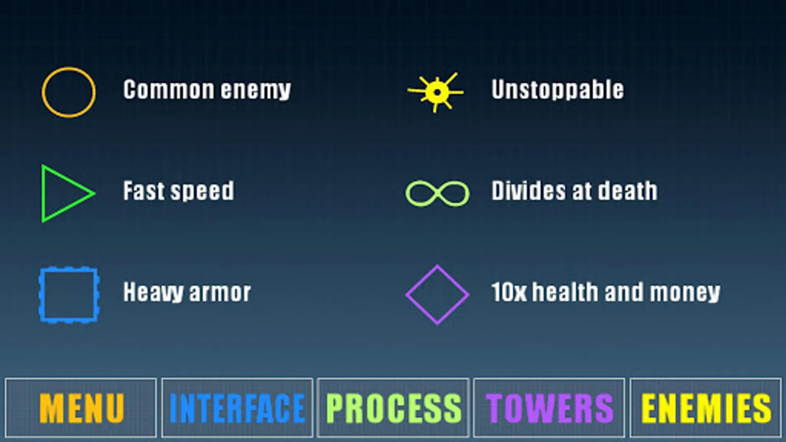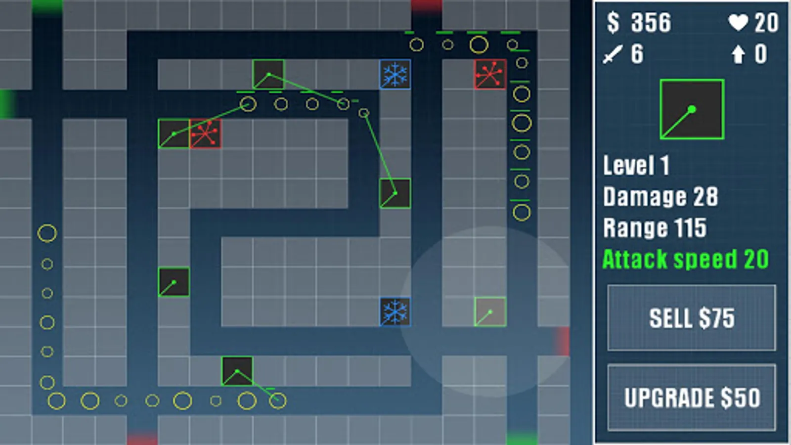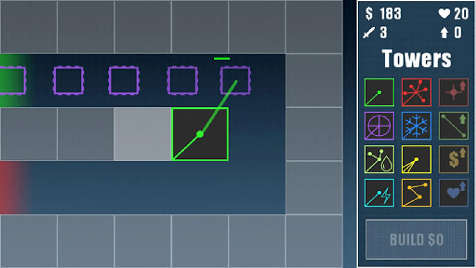 Build towers to protect the base from enemies. The game has 12 types of towers and 6 enemies. Towers and enemies have different colors and abilities. Combine and upgrade towers to more effectively defend the base.