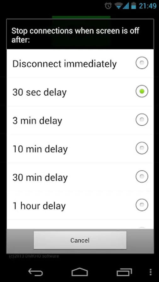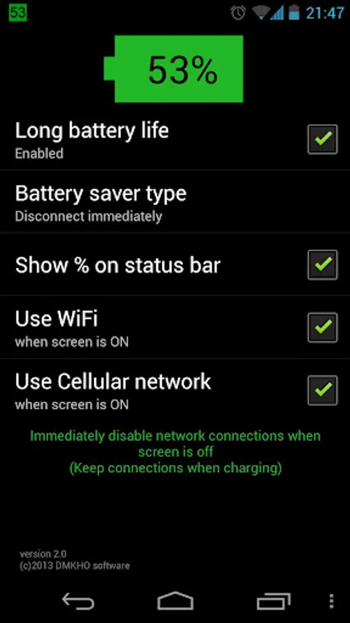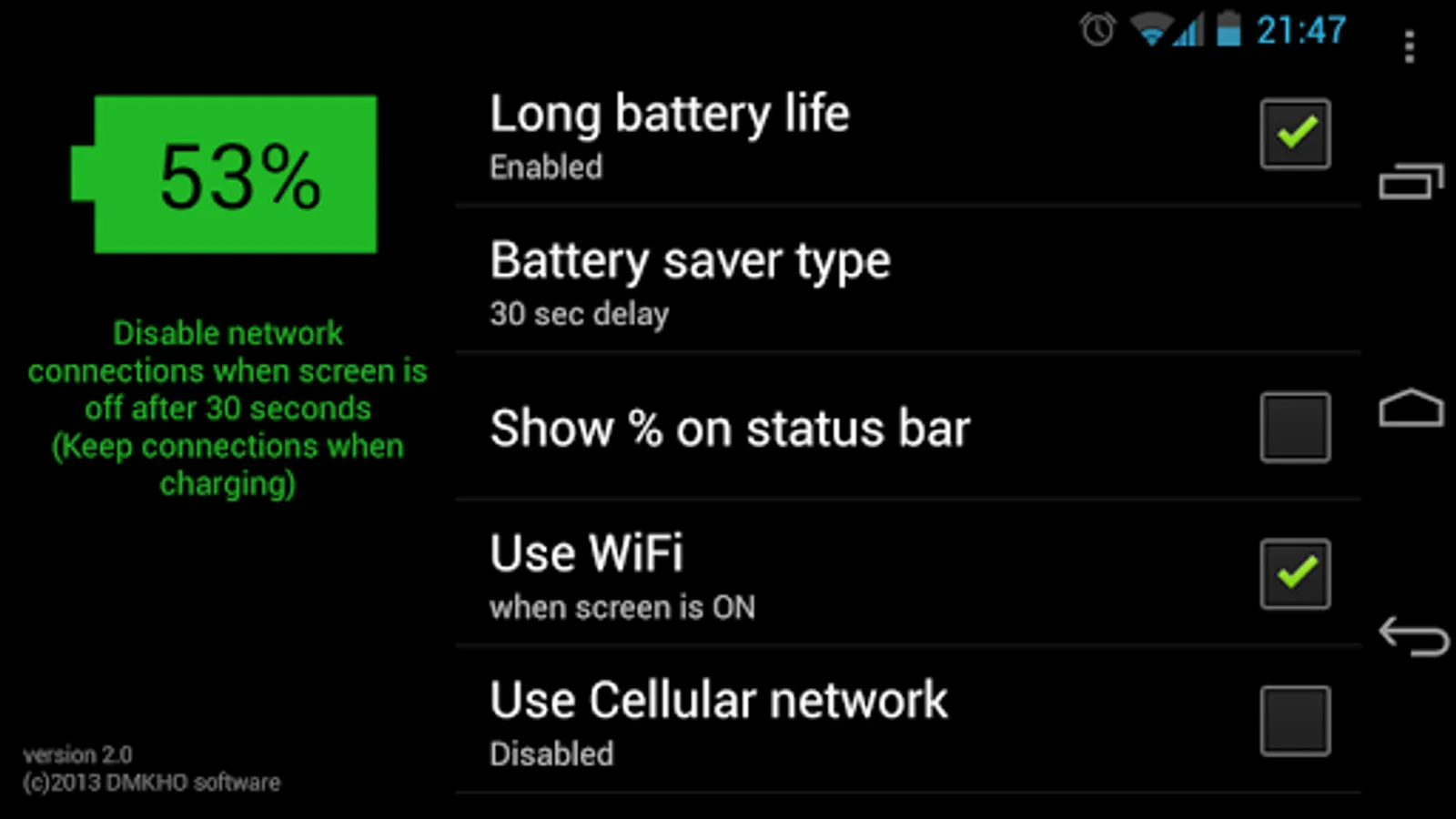 This application is a simplest and most effective way to extend your phone battery life. It auto-disables WiFi and cellular data network connection when screen turned off.
