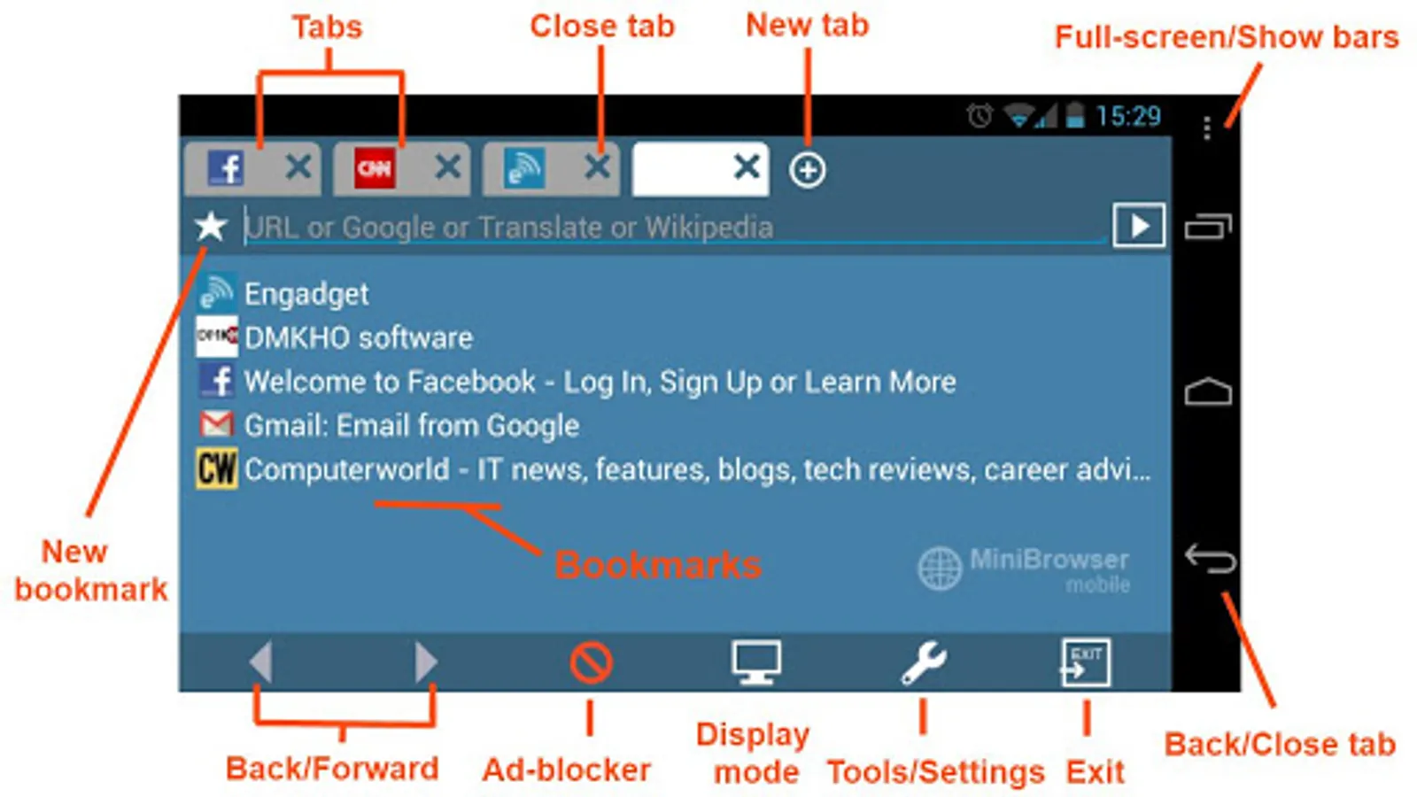 MiniBrowser Mobile is a fast and easy to use internet browser. Strong built-in advertisement blocker will save internet traffic, CPU processing/battery consumption, phone memory usage and make web pages to load much faster. MiniBrowser Ad-blocker is much more powerful than ones used in other browsers. It filters out not only the banners but also all hidden requests to unknown servers which are used by website for collecting statistics about your browsing activity.