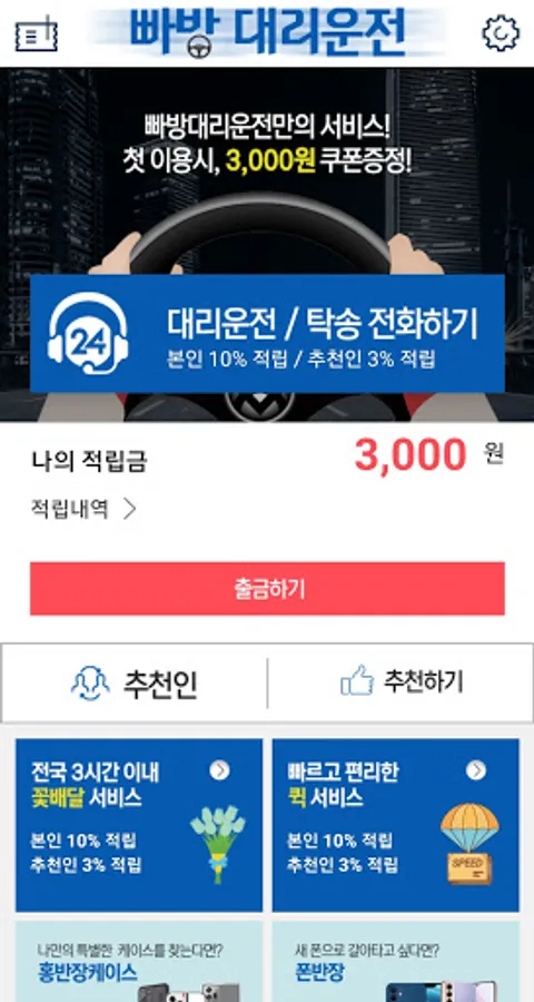 ☞ Cash withdrawal if the total amount of flower delivery, surrogate driving, and vehicle consignment is 10,000 won or more