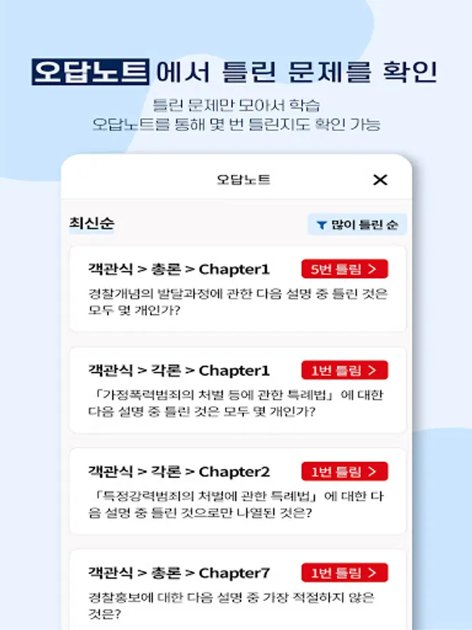 You can collect the wrong questions through the incorrect answer note, and even check how many times you are wrong. You can also collect only the wrong problems and solve them again.