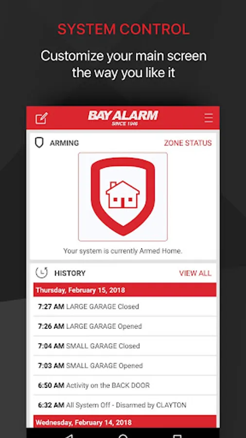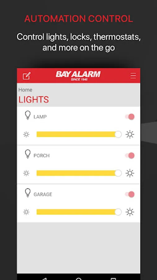 The Bay Alarm™ App allows you to control your security system on-the-go. You can connect to your home or small business system to arm or disarm, manage user codes, view sensor activity, and receive push notifications of system events.