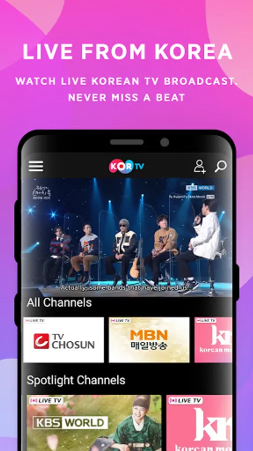 KORTV is the global destination for live Korean entertainment. Stream live broadcasts from the leading Korean television networks such as KBS World, TV Chosun, Arirang TV, and watch the latest movies and shows on-demand!