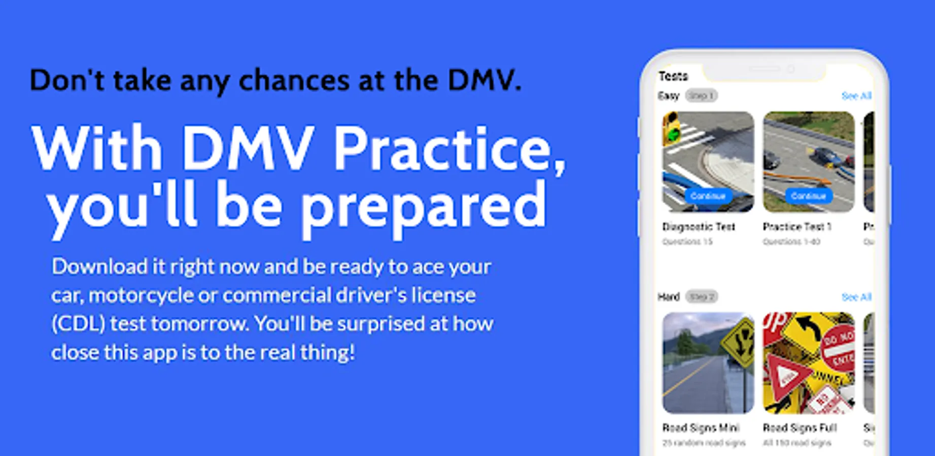 Our practice tests are an effective, interesting way to study for your DMV knowledge test (car, motorcycle or CDL).