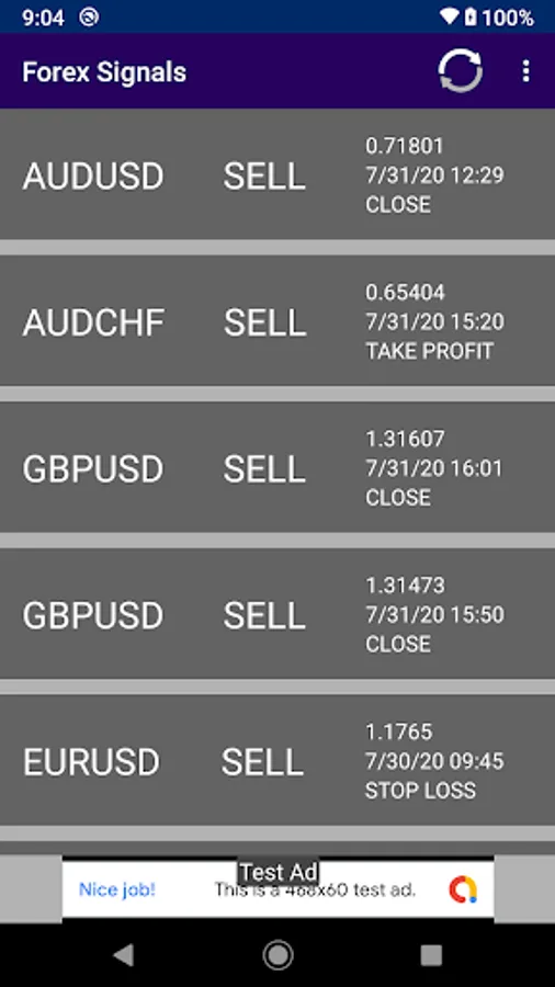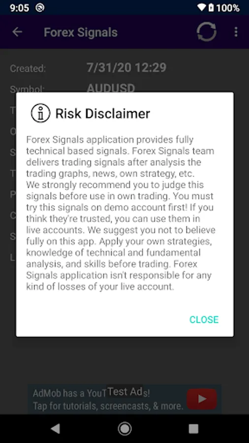 Trading Signals application provides fully technical based signals. Trading Signals team delivers trading signals after analysis the trading graphs, news, own strategy, etc. We strongly recommend you to judge this signals before use in own trading. You must try this signals on demo account first! If you think they're trusted, you can use them in live accounts. We suggest you not to believe fully on this app. Apply your own strategies, knowledge of technical and fundamental analysis, and skills before trading. Trading Signals application isn't responsible for any kind of losses of your live account.